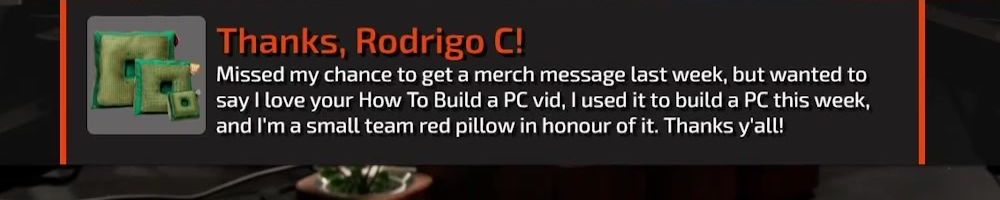 Thanks, Rodrigo C! Missed my chance to get a merch message last week, but wanted to say I love your How To Build a PC vid, I used it to build a PC this week, and I'm a small team red pillow in honour of it. Thanks y'all!