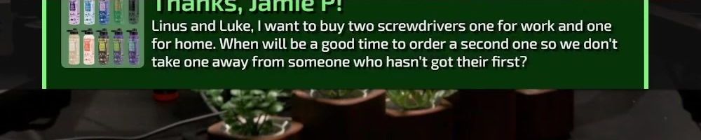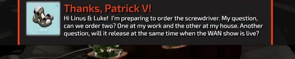 Thanks, Patrick V! Hi Linus & Luke! I'm preparing to order the screwdriver. My question, can we order two? One at my work and the other at my house. Another question, will it release at the same time when the WAN show is live?