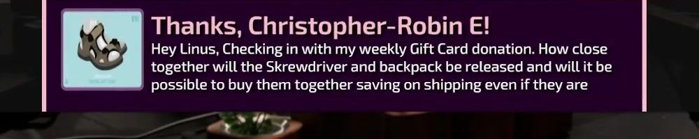 Thanks, JoshuaCarol! Hey Linus and Luke, how about a typing contest between you two... like the FP Exclusive... Also any updates of the screwdriver and backpack? And Linus, why doesn't Luke appear in LTT videos more often?