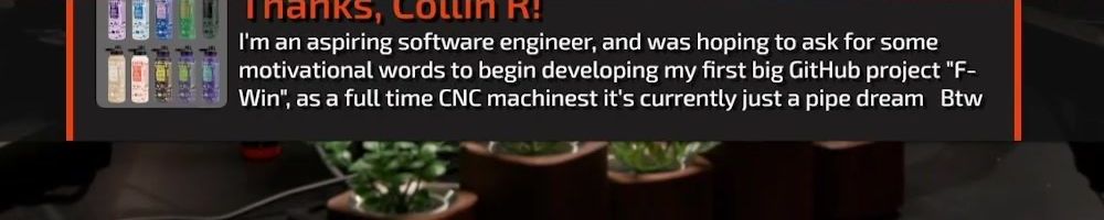 Thanks, Colin K! I'm an aspiring software engineer, and was hoping to ask for some motivational words to begin developing my first big GitHub project "F-Win", as a full time CNC machinest it's currently just a pipe dream Btw