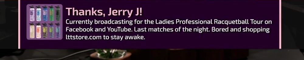 Thanks, Jerry J! Currently broadcasting for the Ladies Professional Racquetball Tour on Facebook and YouTube. Last matches of the night. Bored and shopping lttstore.com to stay awake.