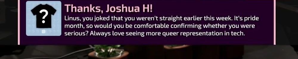 Thanks, Joshua H! Linus, you joked that you weren't straight earlier this week. It's pride month, so would you be comfortable confirming whether you were serious? Always love seeing more queer representation in tech.