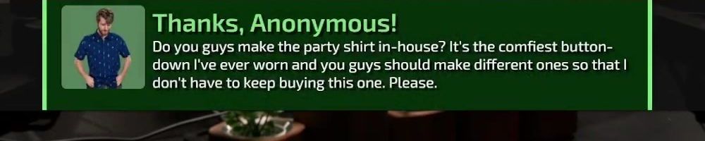Thanks, Anonymous! Do you guys make the party shirt in-house? It's the comfiest button-down I've ever worn and you guys should make different ones so that I don't have to keep buying this one. Please.