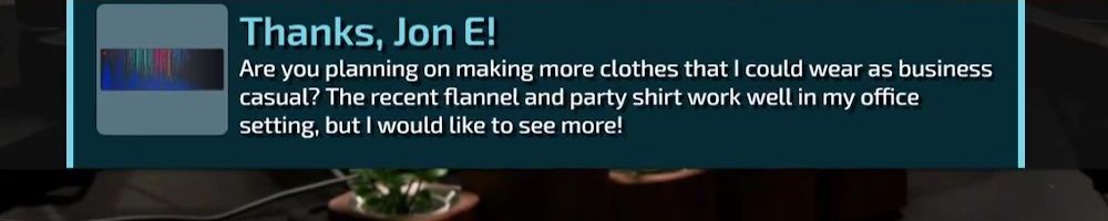 Thanks, Jon E! Are you planning on making more clothes that I could wear as business casual? The recent flannel and party shirt work well in my office setting, but I would like to see more!