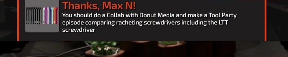 Thanks, Max N! You should do a Collab with Donut Media and make a Tool Party episode comparing racheting screwdrivers including the LTT screwdriver
