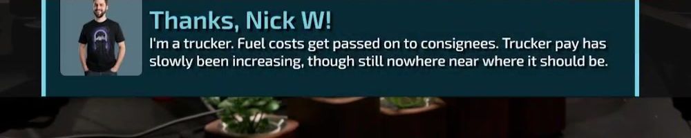 Thanks, Nick W! I'm a trucker. Fuel costs get passed on to consignees. Trucker pay has slowly been increasing, though still nowhere near where it should be.