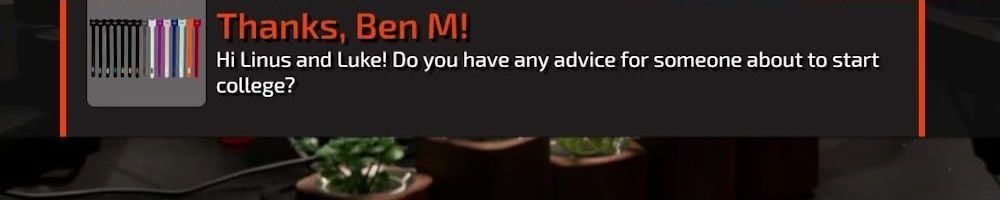 Thanks, Ben M! Hi Linus and Luke! Do you have any advice for someone about to start college?