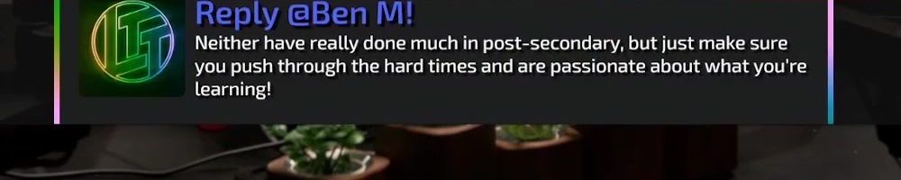 Reply @Ben M! Neither have really done much in post-secondary, but just make sure you push through the hard times and are passionate about what you're learning!