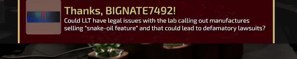 Thanks, BIGNATE7492! Could LLT have legal issues with the lab calling out manufactures selling "snake-oil feature" and that could lead to defamatory lawsuits?