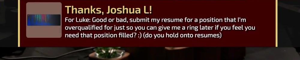 Thanks, Joshua L! For Luke: Good or bad, submit my resume for a position that I'm overqualified for just so you can give me a ring later if you feel you need that position filled? :) (do you hold onto resumes)