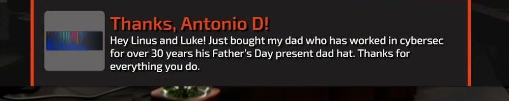 Thanks, Antonio D! Hey Linus and Luke! Just bought my dad who has worked in cybersec for over 30 years his Father's Day present dad hat. Thanks for everything you do.