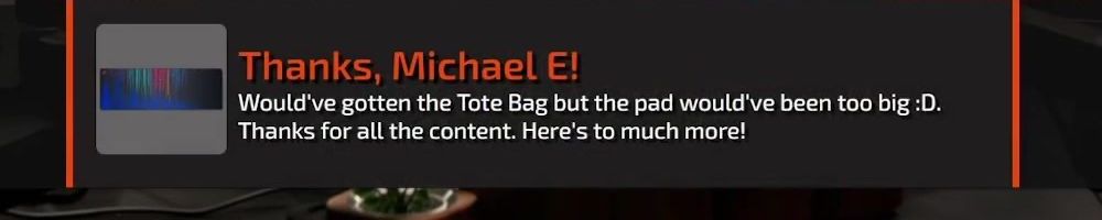 Thanks, Michael E! Would've gotten the Tote Bag but the pad would've been too big :D. Thanks for all the content. Here's to much more!