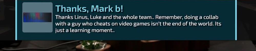 Thanks, Mark b! Thanks Linus, Luke and the whole team.. Remember, doing a collab with a guy who cheats on video games isn't the end of the world. Its just a learning moment.