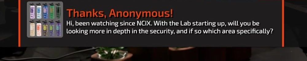 Thanks, Anonymous! Hi, been watching since NCIX. With the Lab starting up, will you be looking more in depth in the security, and if so which area specifically?
