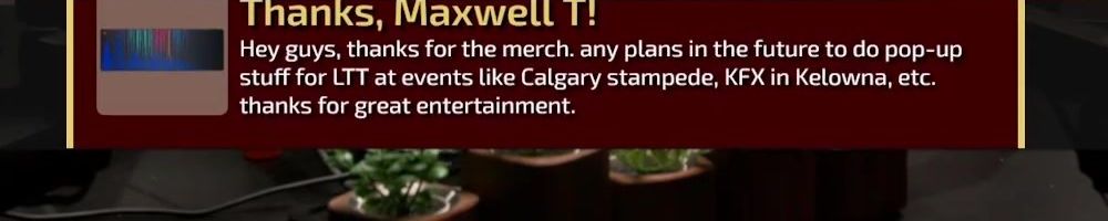 Thanks, Maxwell T! Hey guys, thanks for the merch. any plans in the future to do pop-up stuff for LTT at events like Calgary stampede, KFX in Kelowna, etc. thanks for great entertainment.
