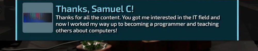 Thanks, Samuel C! Thanks for all the content. You got me interested in the IT field and now I worked my way up to becoming a programmer and teaching others about computers!