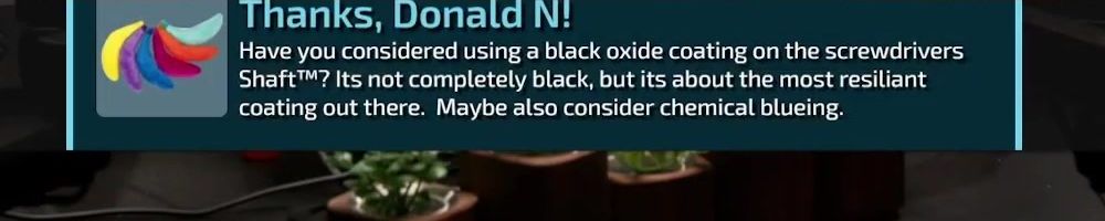 Thanks, Donald N! Have you considered using a black oxide coating on the screwdrivers Shaft? Its not completely black, but its