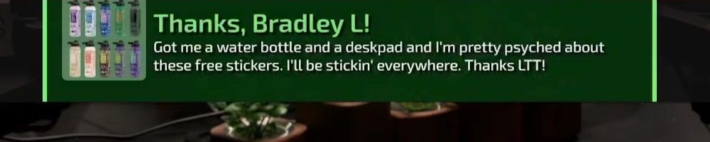 Thanks, Bradley L! Got me a water bottle and a deskpad and I'm pretty psyched about these free stickers. I'll be stickin' everywhere. Thanks LTT!