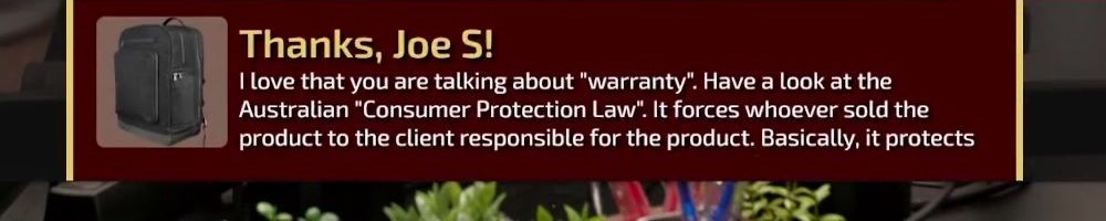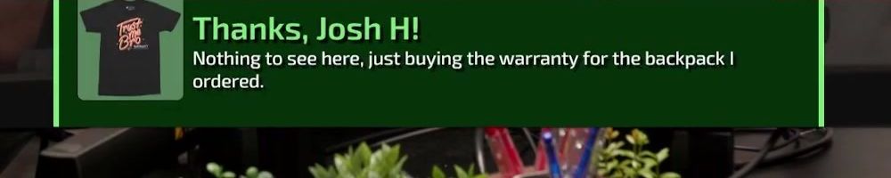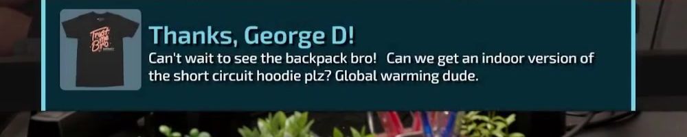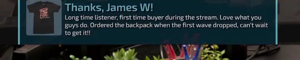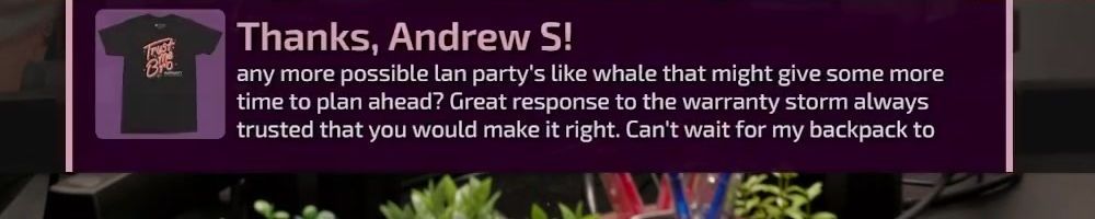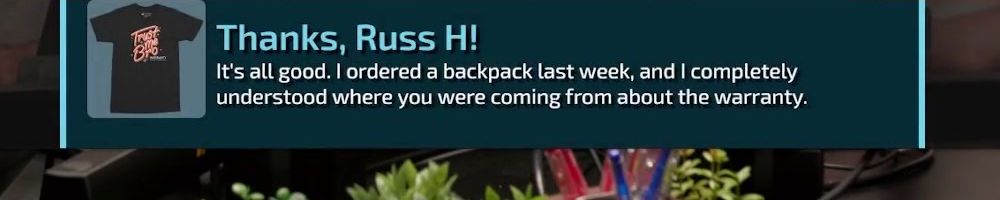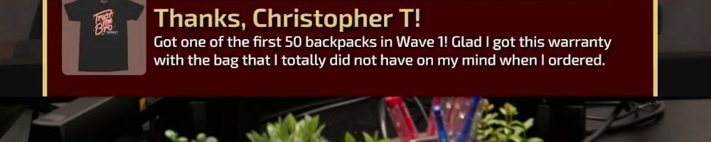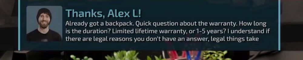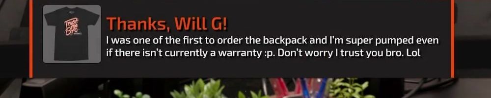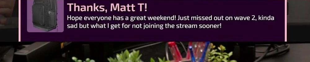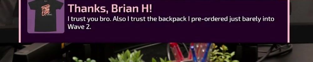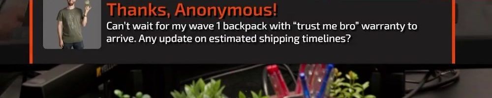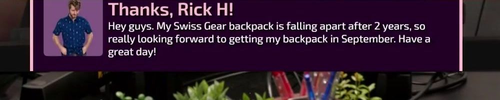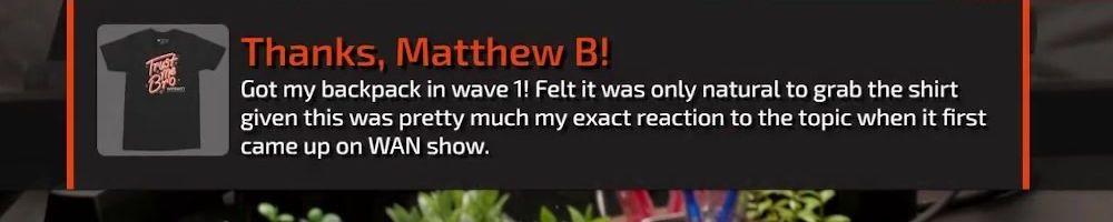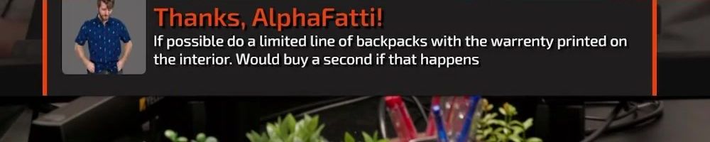 Hi wan show, long time listener, first time live!! I'm super excited for the backpack. Kinda bummed I'm in wave 2 considering I'll be in school for a while but hey it's better late than never! Also happy birthday to