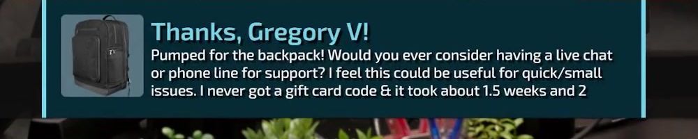 Pumped for the backpack! Would you ever consider having a live chat or phone line for support? I feel this could be useful for quick/small issues. I never got a gift card code & it took about 1.5 weeks and 2