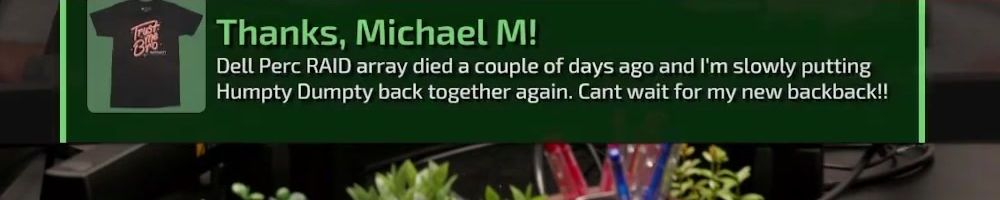 Dell Perc RAID array died a couple of days ago and I'm slowly putting Humpty Dumpty back together again. Cant wait for my new backpack!!