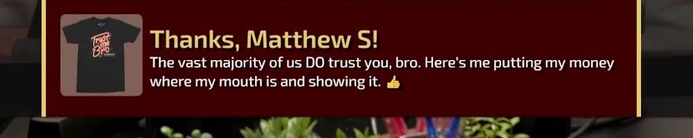 P.S. more 3x trust me bro shirts plz, Much love. Have been watching