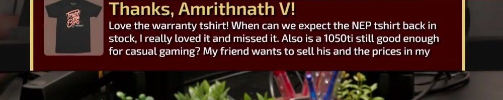 Love the warranty tshirt! When can we expect the NEP tshirt back in stock, I really loved it and missed it. Also is a 1050ti still good enough for casual gaming? My friend wants to sell his and the prices in my