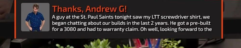A guy at the St. Paul Saints tonight saw my LTT screwdriver shirt, we began chatting about our builds in the last 2 years. He got a pre-built for a 3080 and had to warranty claim. Oh well, looking forward to the