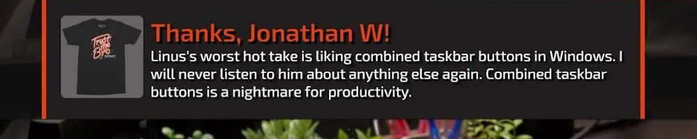 Linus's worst hot take is liking combined taskbar buttons in Windows. I will never listen to him about anything else again. Combined taskbar buttons is a nightmare for productivity.