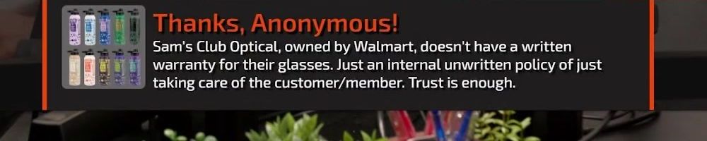 Sam's Club Optical, owned by Walmart, doesn't have a written warranty for their glasses. Just an internal unwritten policy of just taking care of the customer/member. Trust is enough.