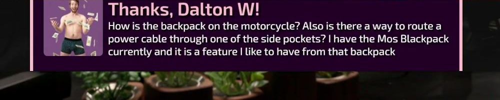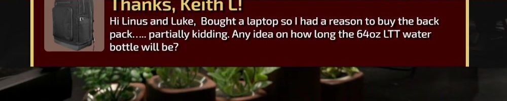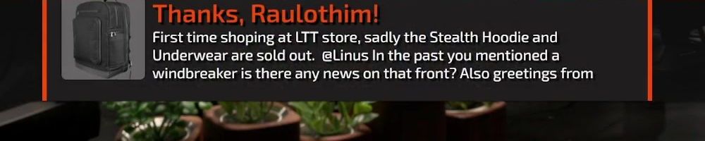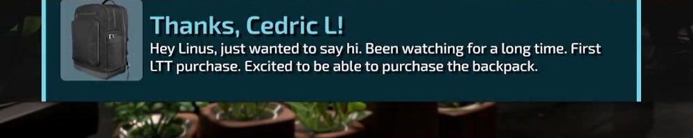Thanks, Cedric L! Hey Linus, just wanted to say hi. Been watching for a long time. First LTT purchase. Excited to be able to purchase the backpack.