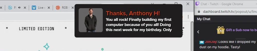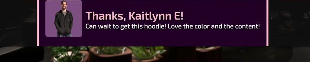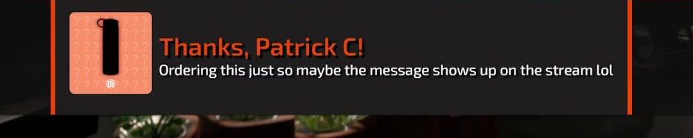 Thanks, Patrick C! Ordering this just so maybe the message shows up on the stream lol