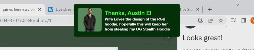 Thanks, Austin E! Wife Loves the design of the RGB hoodie, hopefully this will keep her from stealing my OG Stealth Hoodie