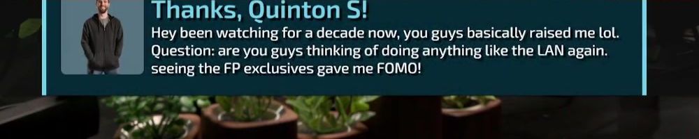 Thanks, Quinton S! Hey been watching for a decade now, you guys basically raised me lol. Question: are you guys thinking of doing anything like the LAN again. seeing the FP exclusives gave me FOMO!