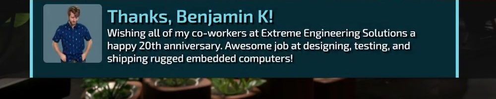 Thanks, Benjamin K! Wishing all of my co-workers at Extreme Engineering Solutions a happy 20th anniversary. Awesome job at designing, testing, and shipping rugged embedded computers!