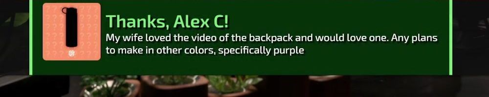 Thanks, Alex C! My wife loved the video of the backpack and would love one. Any plans to make in other colors, specifically purple