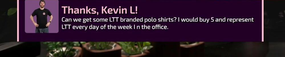 Thanks, Kevin L! Can we get some LTT branded polo shirts? I would buy 5 and represent LTT every day of the week I in the office.