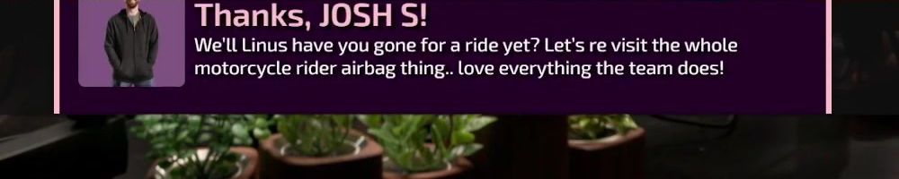 Thanks, JOSH S! We'll Linus have you gone for a ride yet? Let's re visit the whole motorcycle rider airbag thing.. love everything the team does!