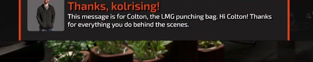 Thanks, kolrising! This message is for Colton, the LMG punching bag. Hi Colton! Thanks for everything you do behind the scenes.