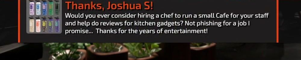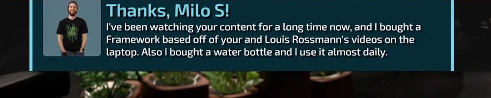 Thanks, Milo S! I've been watching your content for a long time now, and I bought a Framework based off of your and Louis Rossmann's videos on the laptop. Also I bought a water bottle and I use it almost daily.