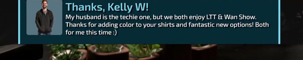 Thanks, Kelly W! My husband is the techie one, but we both enjoy LTT & Wan Show. Thanks for adding color to your shirts and fantastic new options! Both for me this time :)