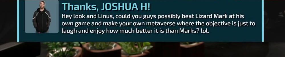 Thanks, JOSHUA H! Hey look and Linus, could you guys possibly beat Lizard Mark at his own game and make your own metaverse where the objective is just to laugh and enjoy how much better it is than Marks? lol.