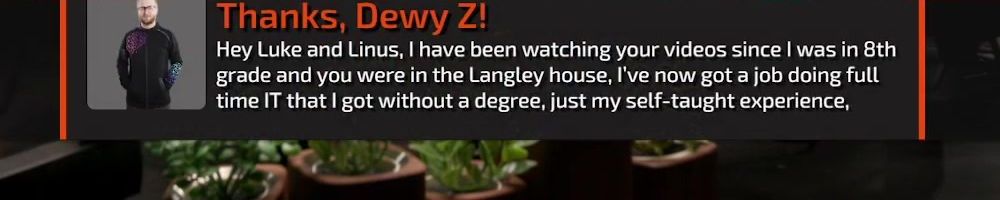 Thanks, Dewy Z! Hey Luke and Linus, I have been watching your videos since I was in 8th grade and you were in the Langley house, I've now got a job doing full time IT that I got without a degree, just my self-taught experience,