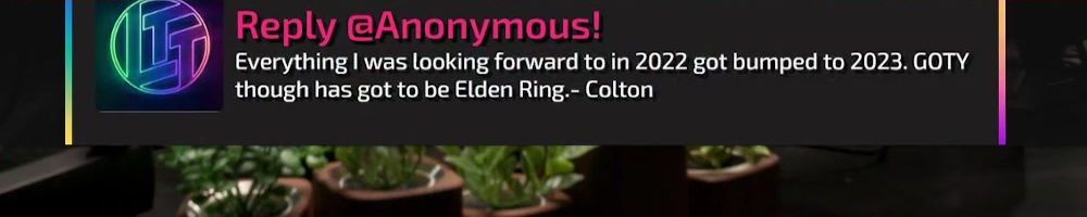 Reply @Anonymous! Everything I was looking forward to in 2022 got bumped to 2023. GOTY though has got to be Elden Ring.- Colton