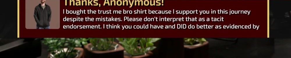 Thanks, Anonymous! I bought the trust me bro shirt because I support you in this journey despite the mistakes. Please don't interpret that as a tacit endorsement. I think you could have and DID do better as evidenced by