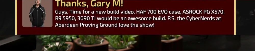 Thanks, Gary M! Guys, Time for a new build video. HAF 700 EVO case, ASROCK PG X570, R9 5950, 3090 TI would be an awesome build. P.S. the CyberNerds at Aberdeen Proving Ground love the show!