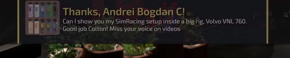 Thanks, Andrei Bogdan C! Can I show you my SimRacing setup inside a big rig, Volvo VNL 760. Good job Colton! Miss your voice on videos