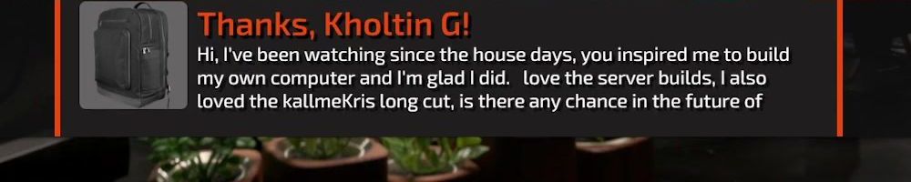 Thanks, Kholtin G! Hi, I've been watching since the house days, you inspired me to build my own computer and I'm glad I did. love the server builds, I also loved the kallmeKris long cut, is there any chance in the future of