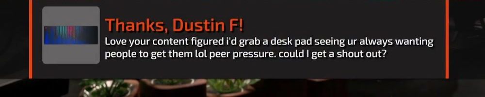 Thanks, Dustin F! Love your content figured i'd grab a desk pad seeing ur always wanting people to get them lol peer pressure. could I get a shout out?