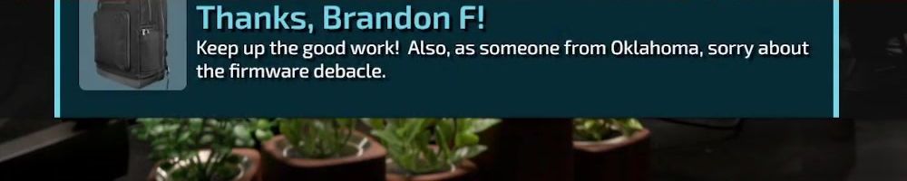 Thanks, Brandon F! Keep up the good work! Also, as someone from Oklahoma, sorry about the firmware debacle.